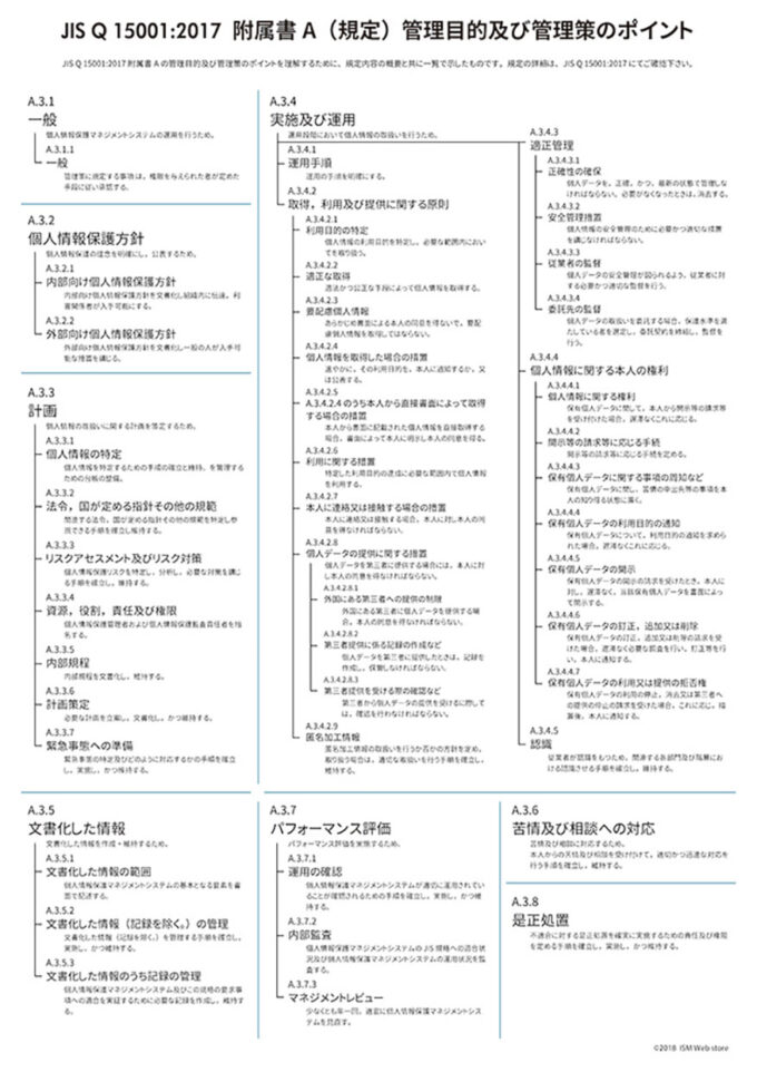JIS Q 15001:2017 附属書Aの管理目的と管理策にポイントとなる解説をつけ、各項目の規定の意図が一覧でわかるようにしてみました。