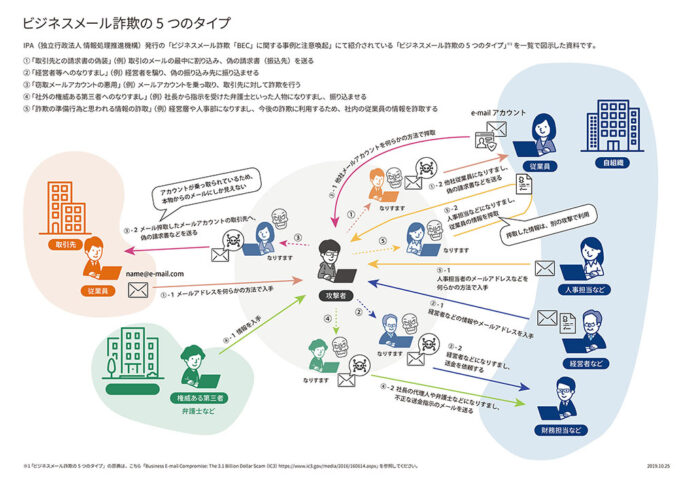 下図は、IPA(独立行政法人 情報処理推進機構)が、注意喚起とともに公開している、レポート「ビジネスメール詐欺 『BEC』に関する事例と注意喚起」で解説されている“ビジネスメール詐欺の5つのタイプ”をまとめたものです。