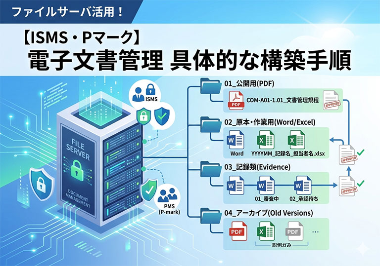 ISMSやPマークの文書管理を、専用システムなしで低コストに運用する方法を専門家が解説。ファイルサーバを活用した理想的なフォルダ構成案や、PDFスタンプ等を用いた承認フローの構築手順、LLM活用のコツまで具体的に紹介します。規格要求事項(7.5.3)を満たしつつ、実務負担を軽減するヒントが満載です。